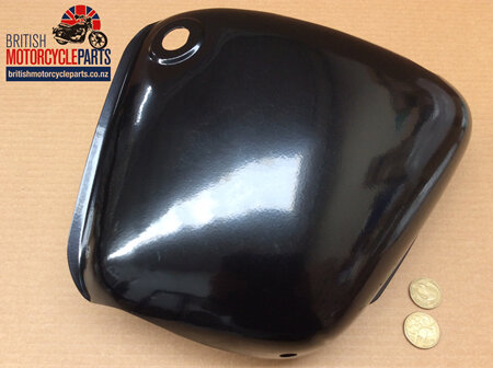 Steel left hand side panel as fitted to 650cc Triumph TR6 Trophy and T120 Bonneville models from 1967 only. Has one Yale Switch Hole. Painted black.