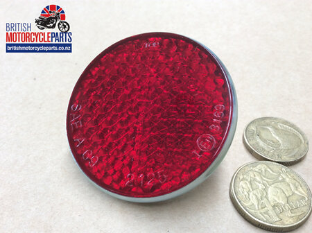 Pattern Lucas Round Red Reflector as fitted to various 500cc, 650cc & 750cc Triumph models. Also fitted to some BSA, Norton & Royal Enfield models.
