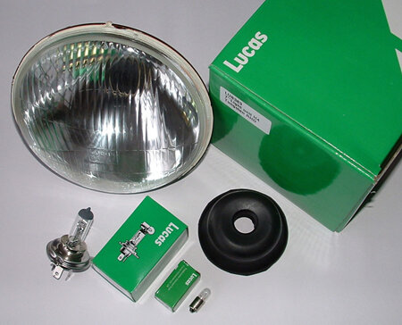 Genuine Lucas 7″ Halogen headlight conversion including bulbs. Domed glass with LUCAS H4 in the lens. Right Hand Drive.